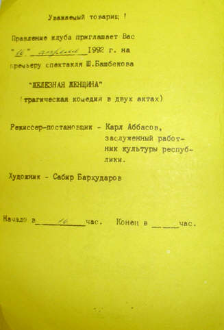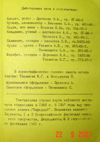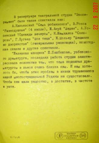Программа - приглашение театральной студии "Эксперимент" ГНИ. (Прислали Е.А. Хохлова, Г. Н. Тарусин)