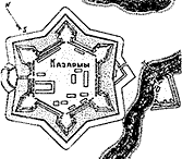 вперед угол шестиугольника–бастионом для двух пушек. Крепость